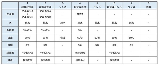 洗浄プロセス(洗浄条件)は汚れの種類・汚れの度合いなど個別の状況に応じて最適化することが重要です。