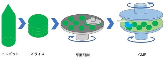 パワー半導体の製造は材料であるSiとCからSiCインゴットを作り、円盤状にスライス、平面研削や